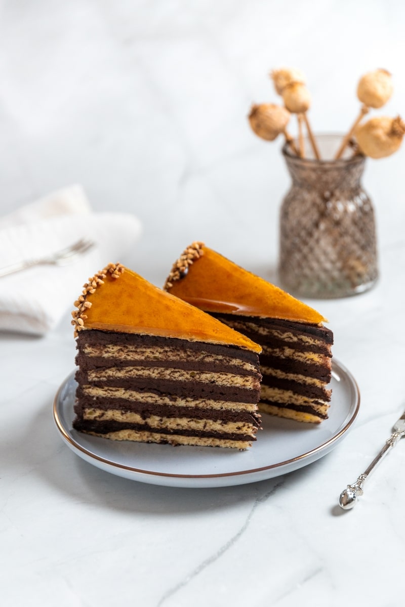 Világos piskóták között, tej nélkül főzött csokoládékrém, teteje karamellizált cukorral díszítve.