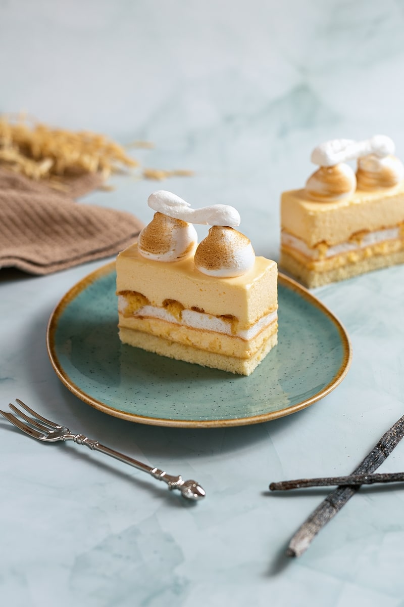 Piskóta és kardinális tészta között könnyű vanília krém, tejszínhabbal díszítve .