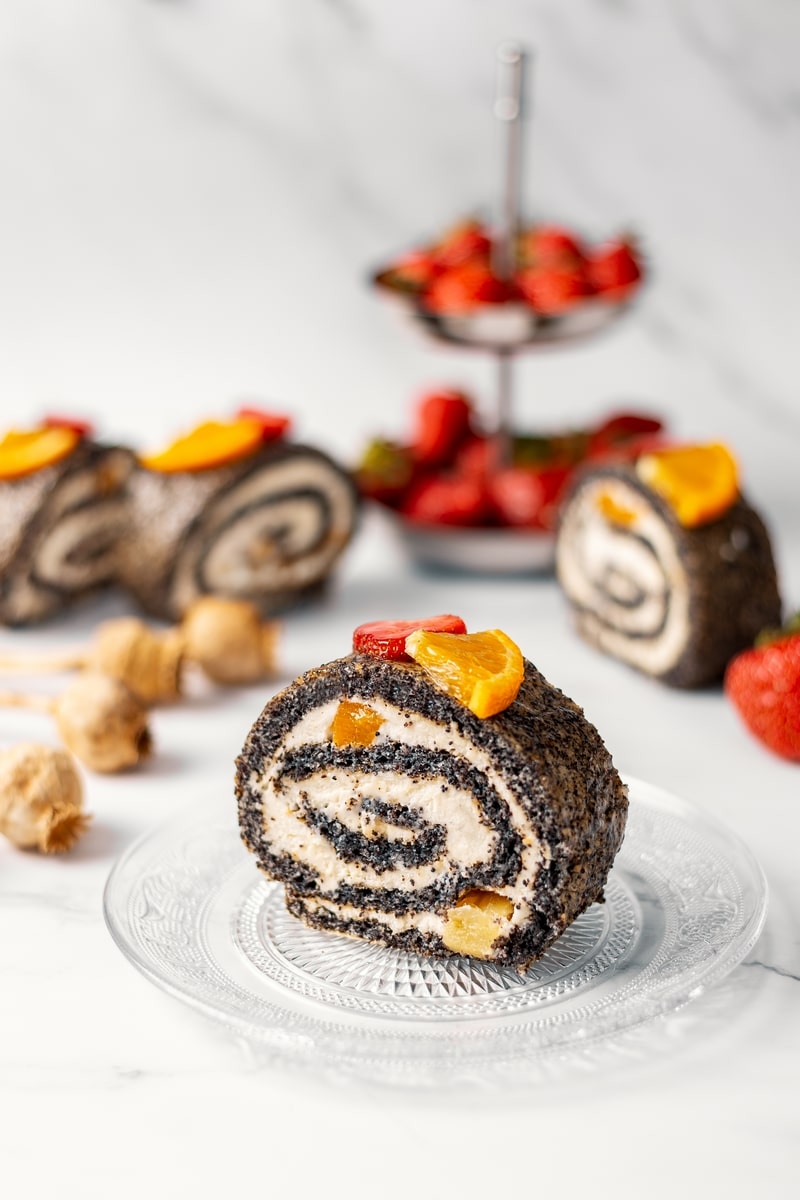 Mákos lap, vaníliás tejhabos krémmel, vegyes gyümölcsdarabokkal töltve, gyümölccsel díszítve.