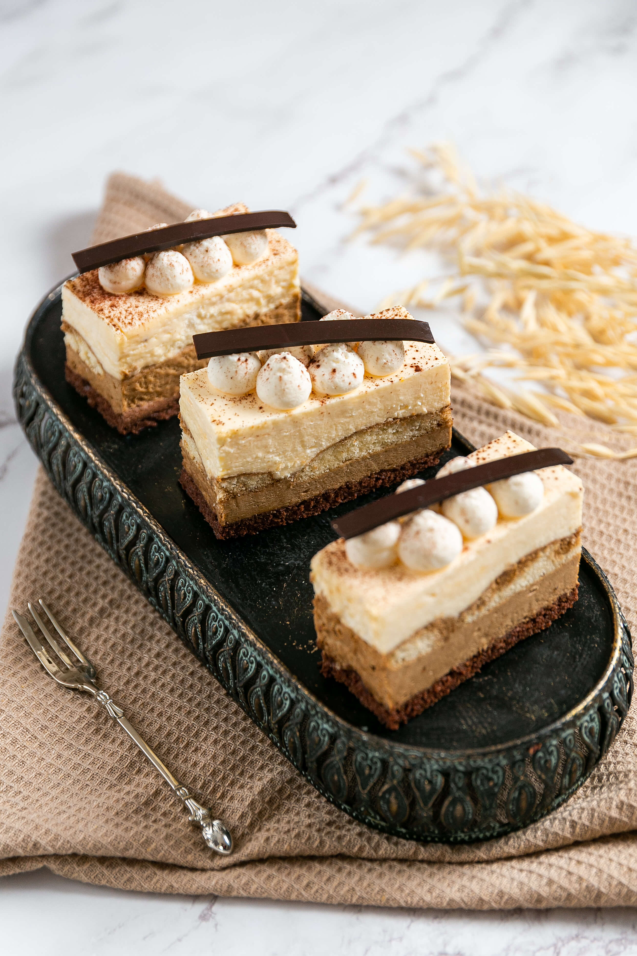 Kakaós piksótán lágy kávé mousse terül el, rajta babapiskóta réteggel és habkönnyű mascarponeval.