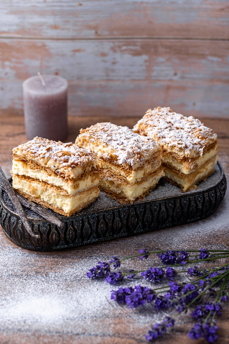 Leveles lapok között egyedi recept alapján készült sárgakrém,teteje porcukorral leszórva.